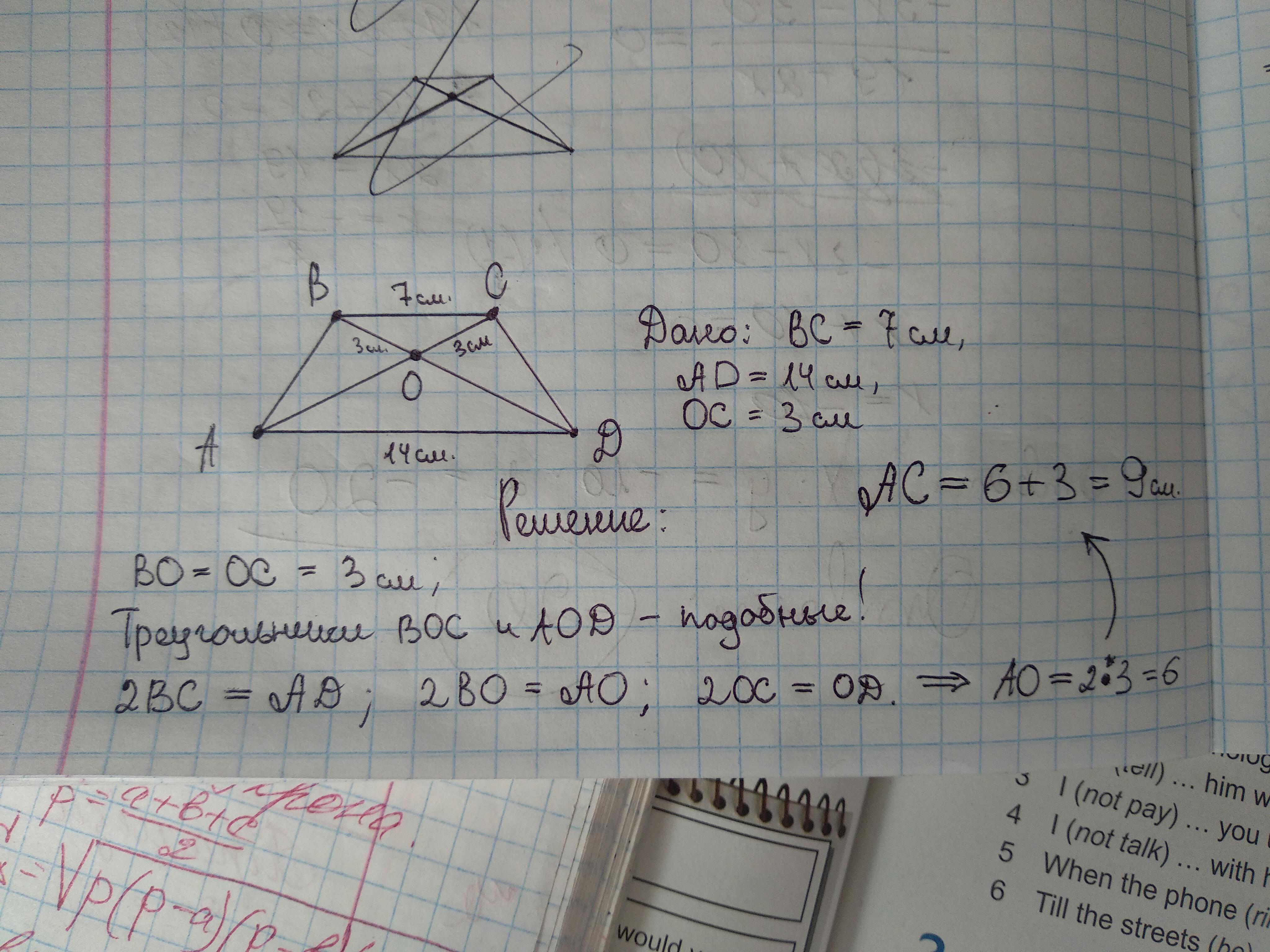 В трапеции ABCD основание BC=7см, основание AD=14см. Диагонали трапеции пересекаются в точке O, причём OC=3см. Найти AC.