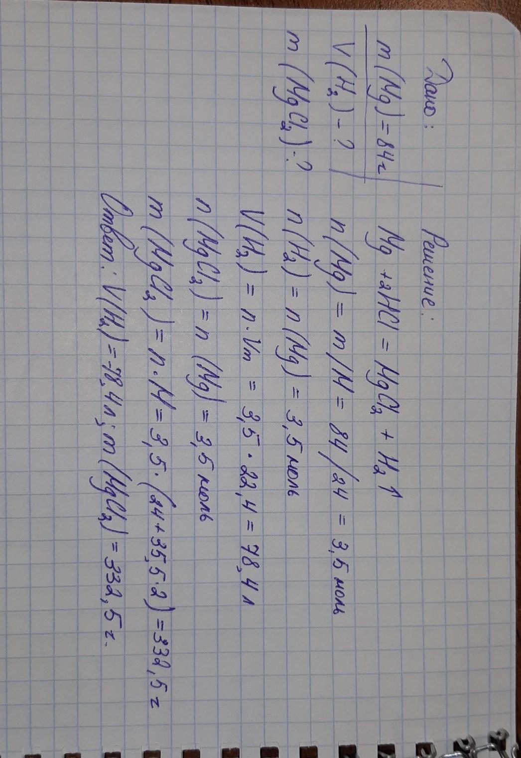 Обчисліть об'єм газу (н.у ) і масу солі , що утворилися під час реакції 84г магнію з хлоридною кислотою