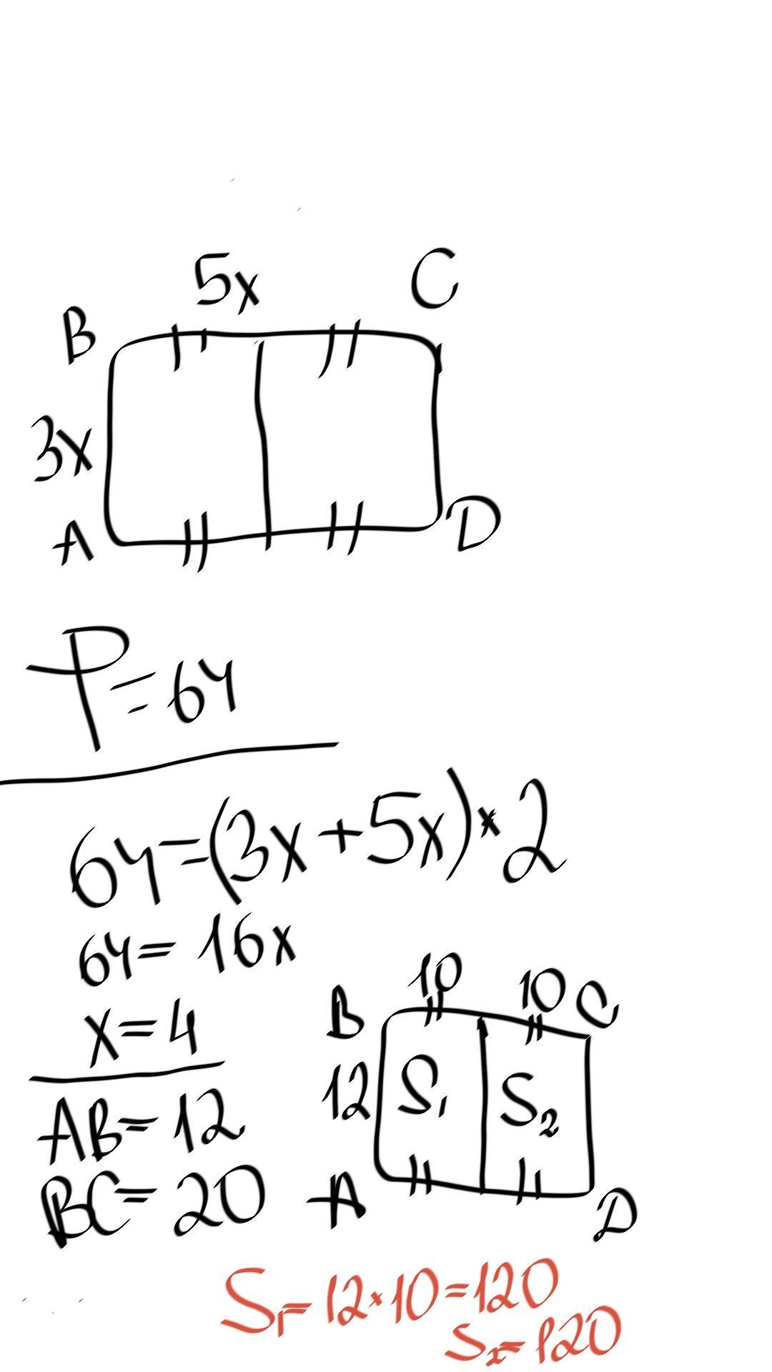 Стороны прямоугольника периметра 64 см относятся как 3:5. Его разрезали на два одинаковых прямоугольника. Чему в кв. см равна площадь каждой из полученных частей?