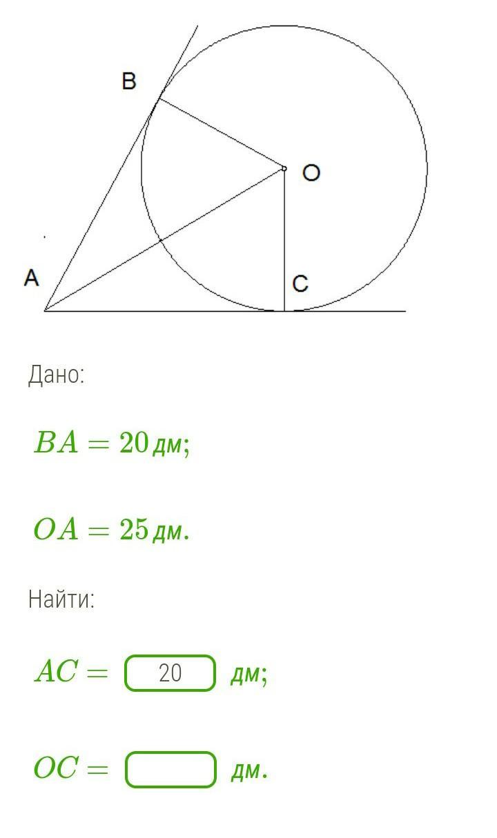 АВ=АС=20 дм, как отрезки касательных, проведенных из одной точки