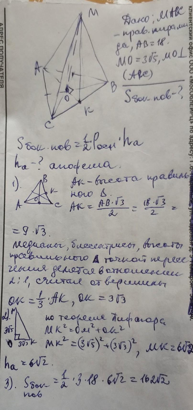 Сторона основания правильной треугольной пирамиды равна 18 , а высота пирамиды равна 3√5