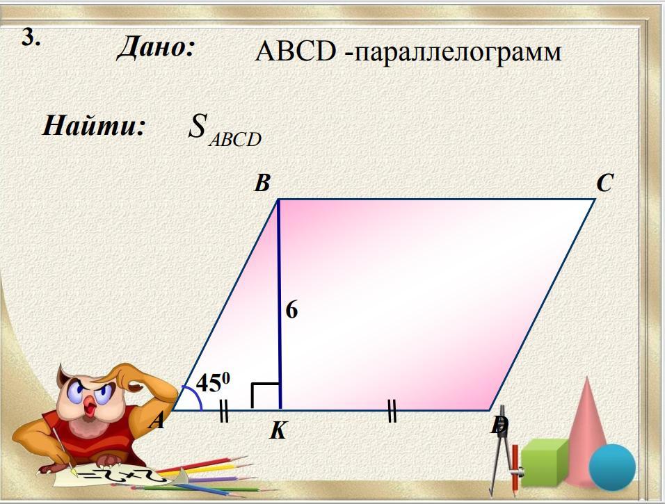 Найти площадь парралелограмма CK 6 (высота) а угол 45 градусов как решать?