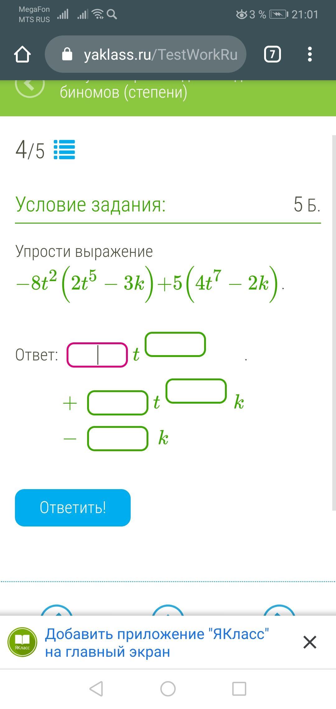 2) -8t²(2t⁵-3k)+5(4t⁷-2k)= -16t⁷+24t²k+20t⁷-10k=4t⁷+24t²k-10k