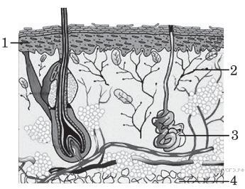 Ответ: 1 - эпидермис, Эпидермис образован многослойным эпителием. Основной функцией эпидермиса кожи является защита (от механических воздействий, ультрафиолетового излучения, бактерий и пр.)