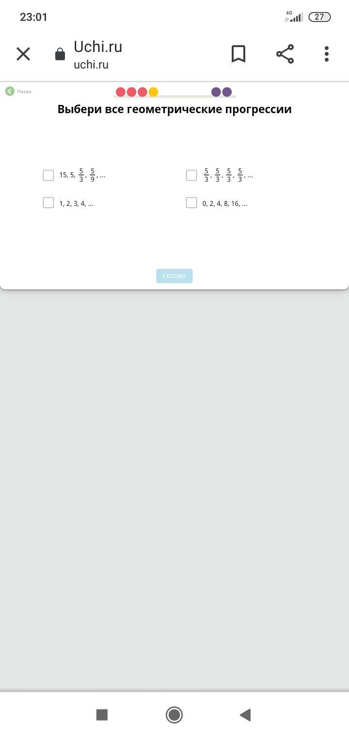 2) 5/3; 5/3; 5/3; 5/3;...являются членами геометрической прогрессии,так как как каждый последующий член получен из предыдущего умножением на 1.