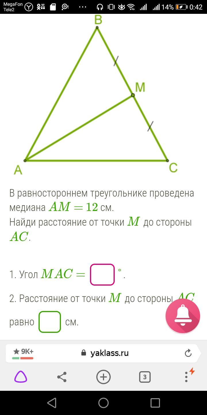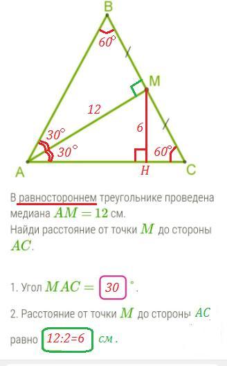 Медиана АМ=12 см. Медиана в равностороннем треугольнике является и его биссектрисой ⇒ ∠ВАМ=∠МАС=30° .