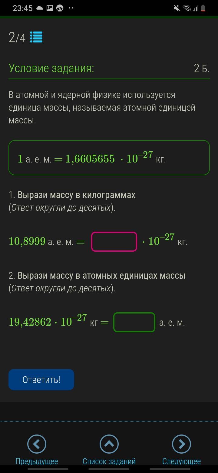 19,42862*10^(-27) кг = 19,42862:1,6605655 = 11,7 а.е.м.