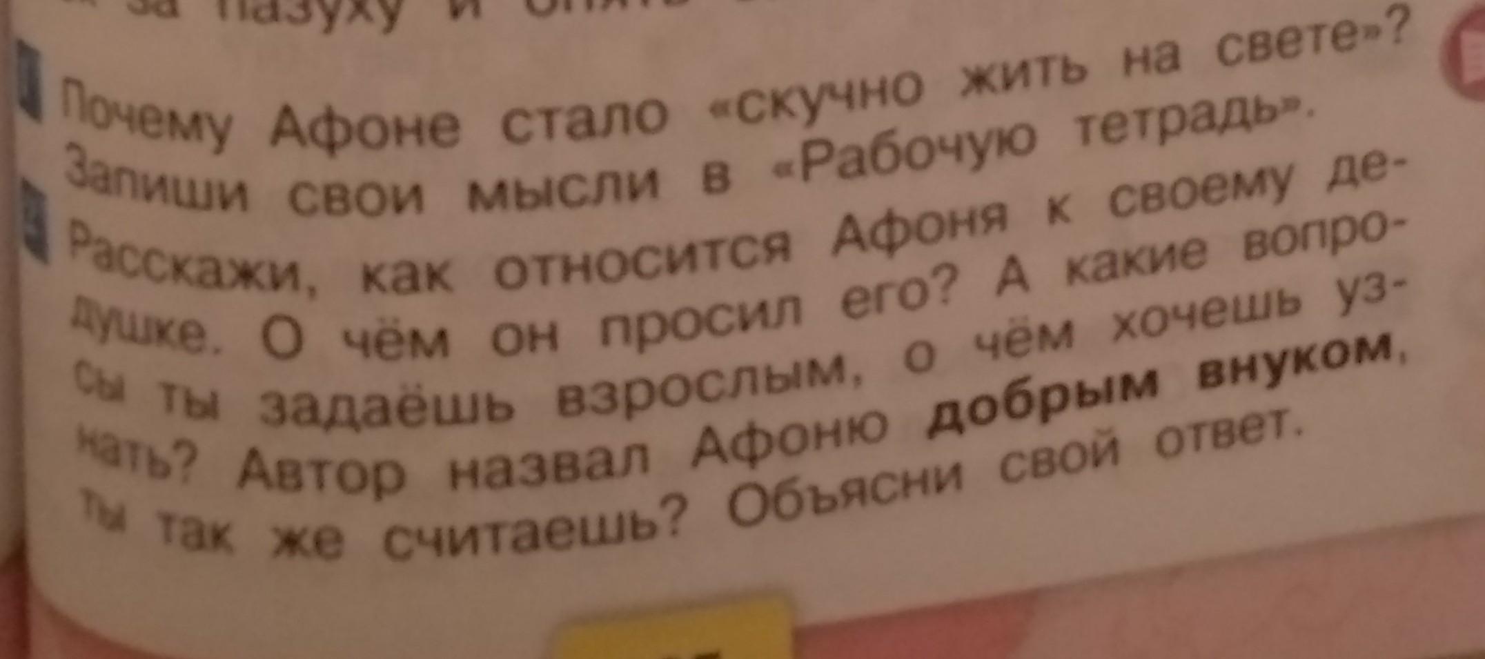 2 вопрос: мальчик любил своего 87- летнего дедушку. Афоня просил его не засыпать, потому что его было одиноко и скучно одному.