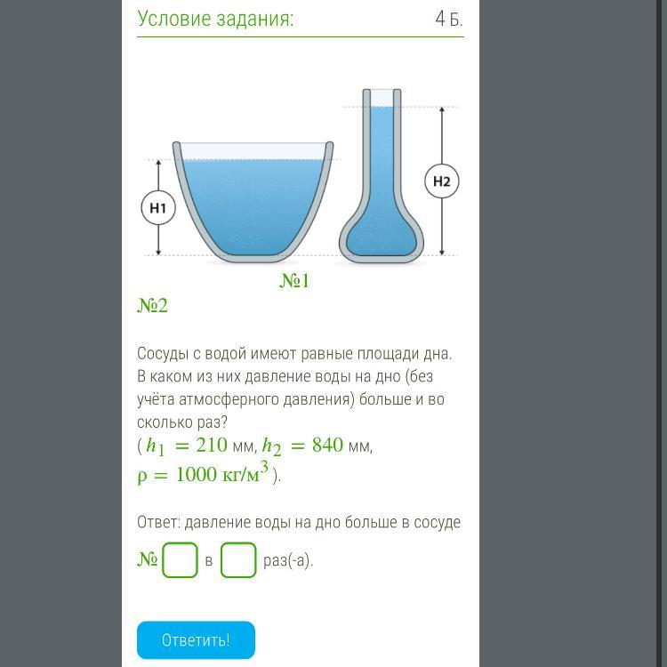 p2/p1=pgh2/pgh1=h2/h1=840мм/210мм=4 раза