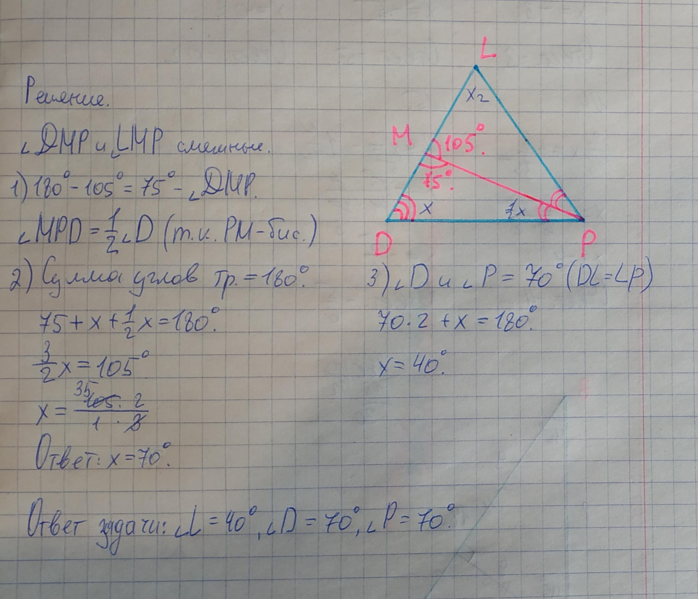 В равнобедренном треугольнике DLP проведена биссектриса PM угла P у основания DP,