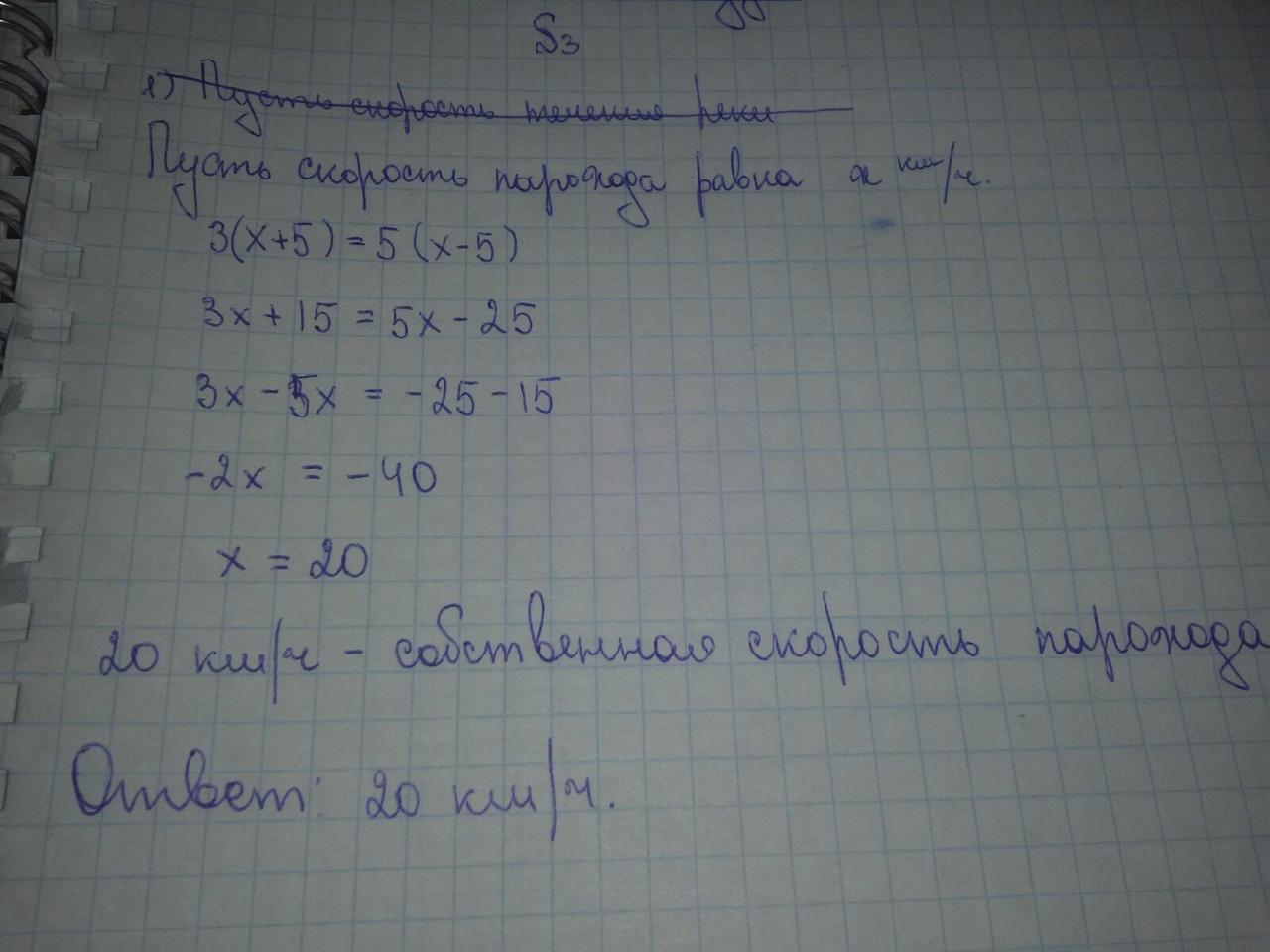Пароход проплыл путь по течению реки за 3 часа, а назад за 5 часов. Скорость течения реки 5 км/ч. Найдите скорость парохода в тихой воде?