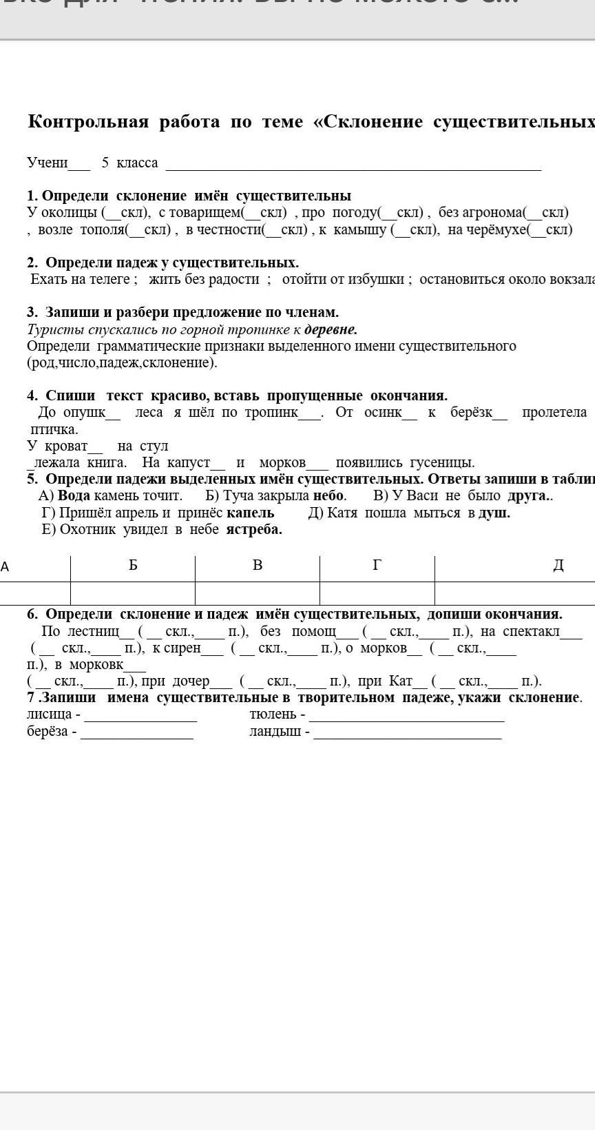 А (Им. п.), Б (В. п.), В (Д. п.), Г (В. п.), Д (В. п.).