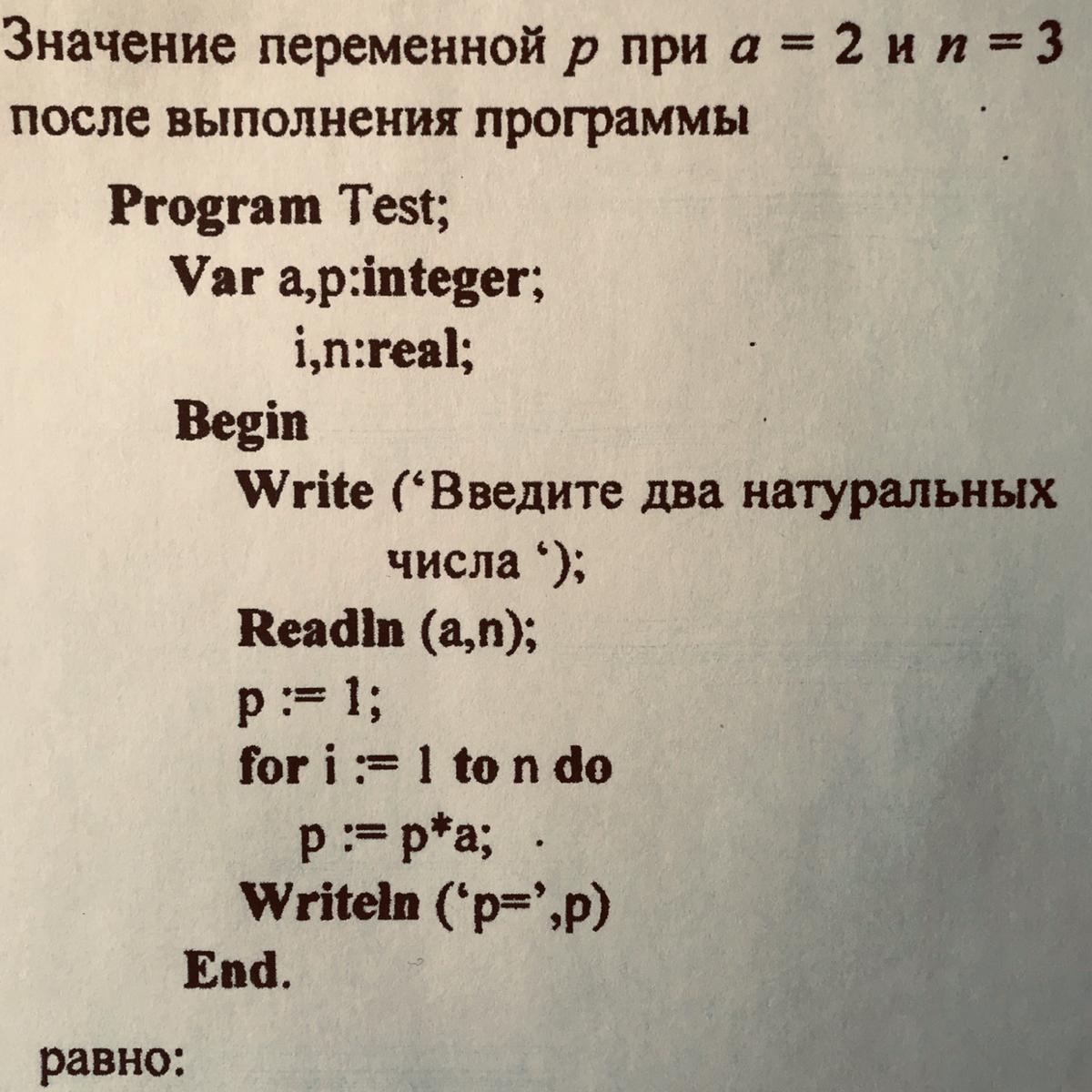 Там цикл, который идет от 1 до n (3), в теле цикла p умнажается на a, и так будет n раз. То есть, 1*2=2 => 2*2= 4 => 4*2 = 8