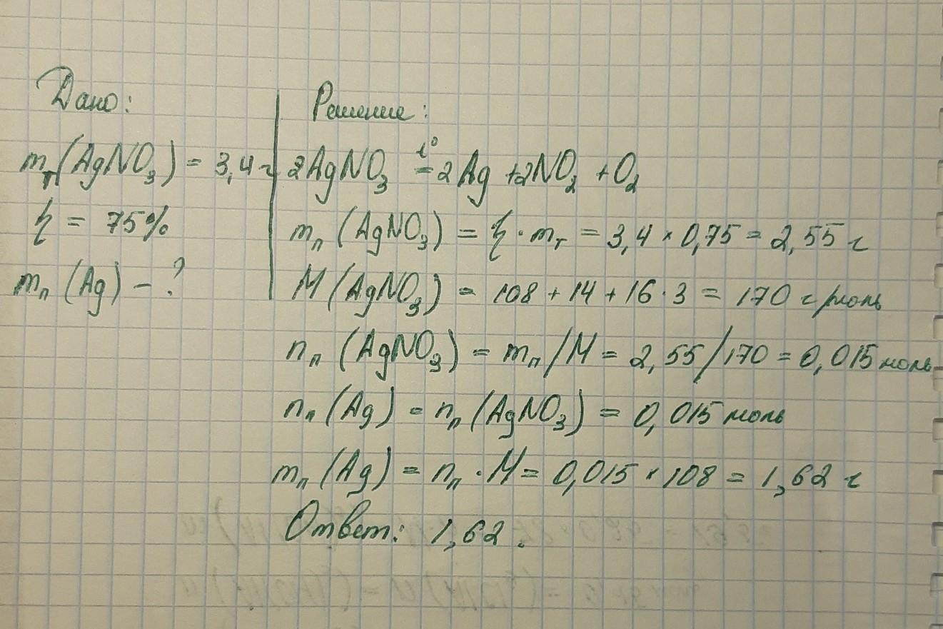 Рассчитайте массу серебра, которую можно получить при термическом разложении 3,4 г нитрата серебра (I), если известно, что выход реакции составил 75%.