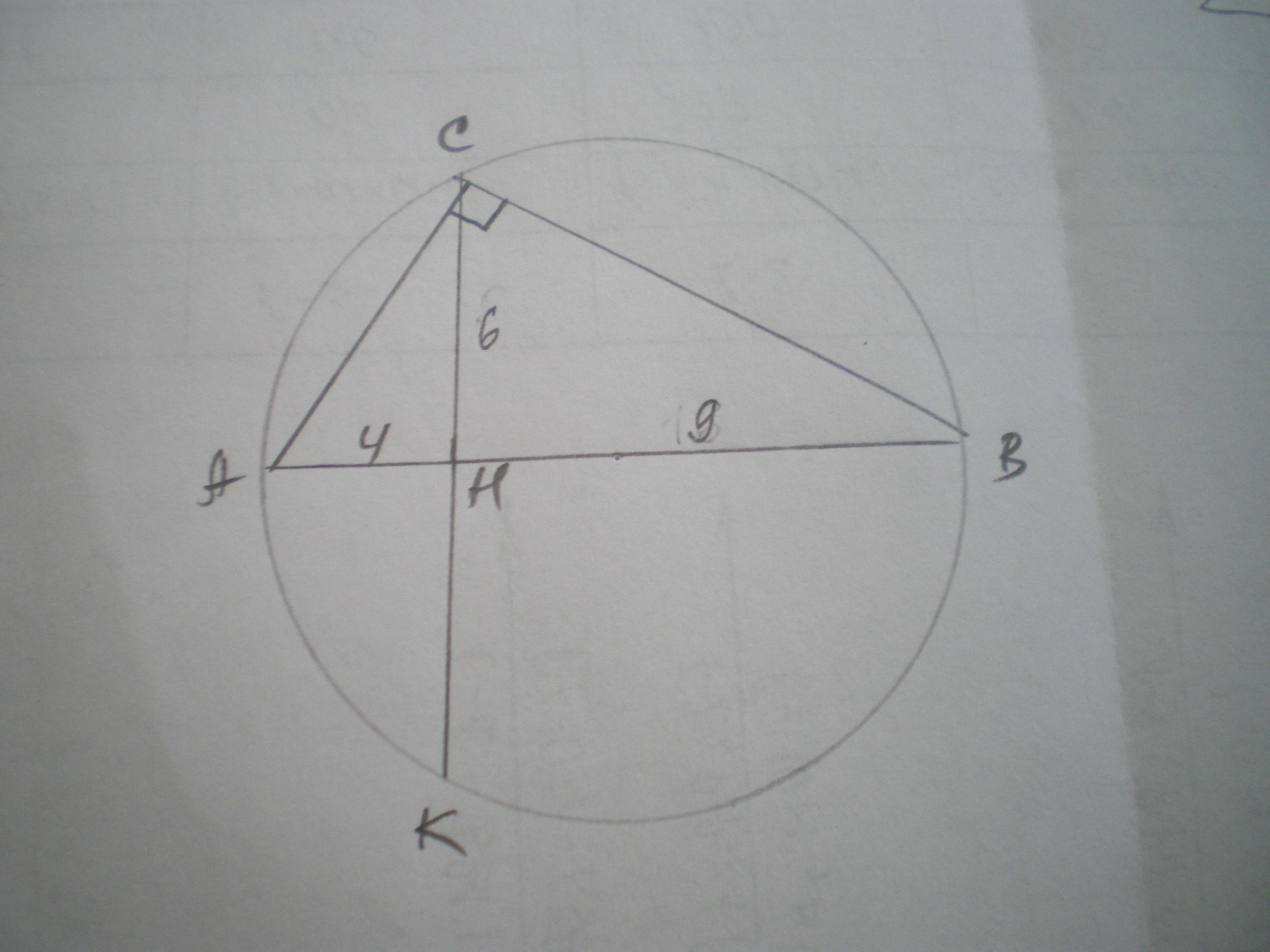 Имеем ΔАВС - прямоугольный, т.к. ∠С опирается на диаметр окружности. СН - высота, т.к. по условию СК⊥АВ. По теореме, СН=√(АН*ВН)=√(4*9)=√36=6 см.