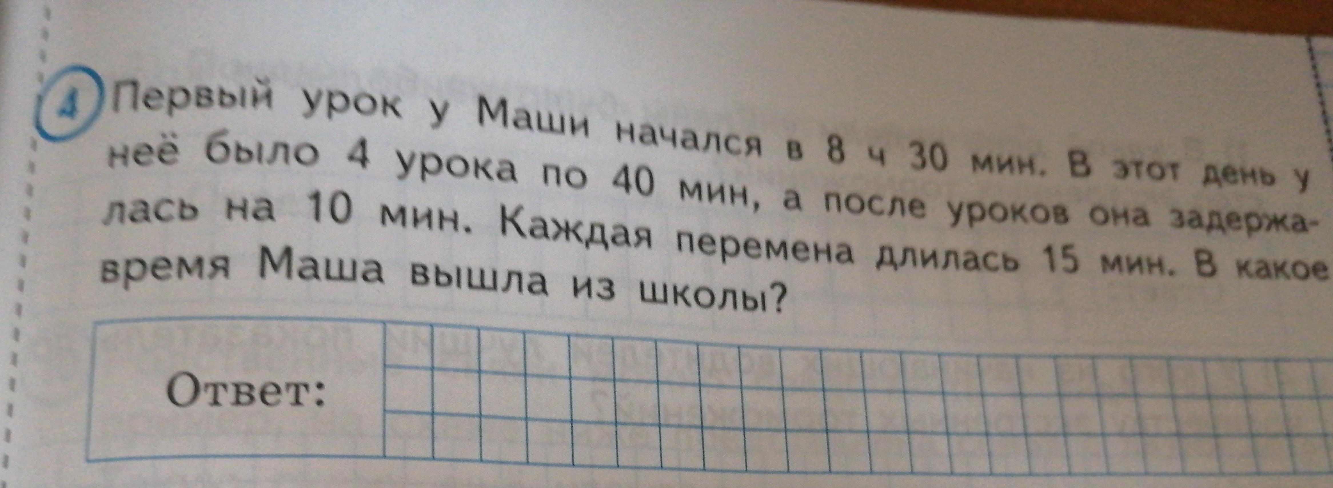 Если между уроками есть перемена, то 8 ч 30 мин + (4 * 40 мин) + ((4-1) * 15 мин) + 10 мин = 8 ч 30 мин + 160 мин + 45 мин + 10 мин = 8 ч 235 мин