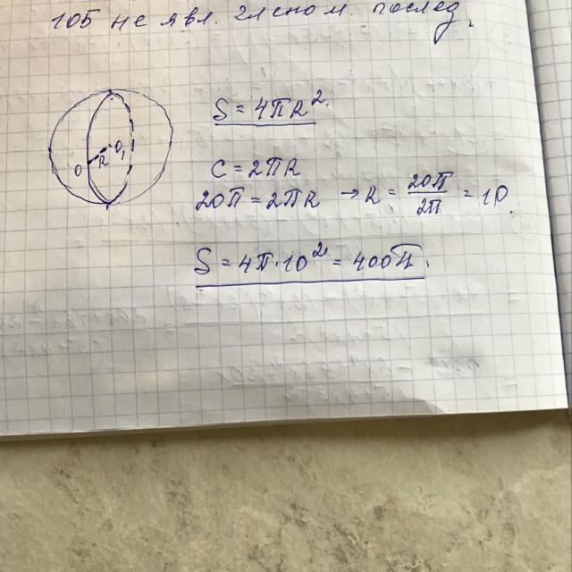 Длина большого круга шара (с = 2ПR) равна 20П см. Найдите площадь сферы.