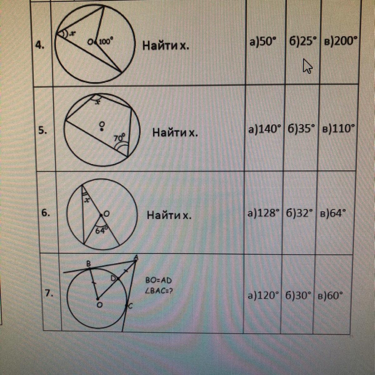 Объяснение:4)Т.к центральный угол О =100°=> и дуга, на которую он смотрит тоже равна 100°,тогда х=50,потому что он вписаный(вписаный угол равен половине дуги ,на которую он опирается)