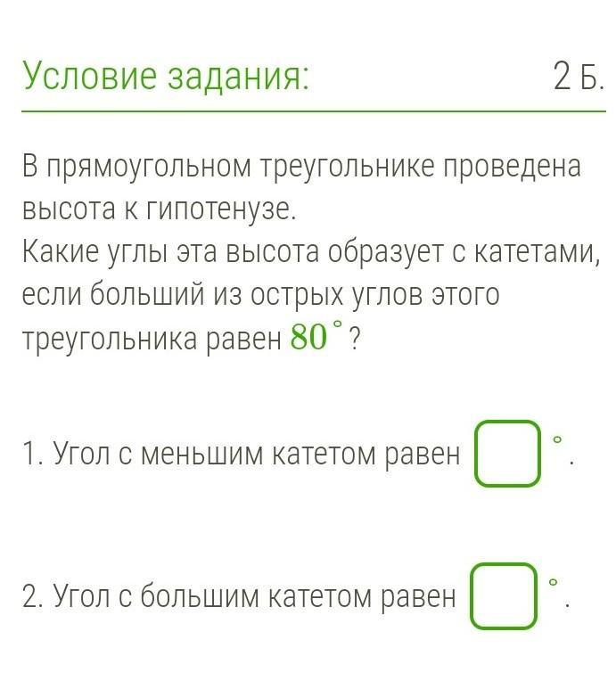 Какие углы эта высота образует с катетами, если больший из острых углов этого треугольника равен 80°?