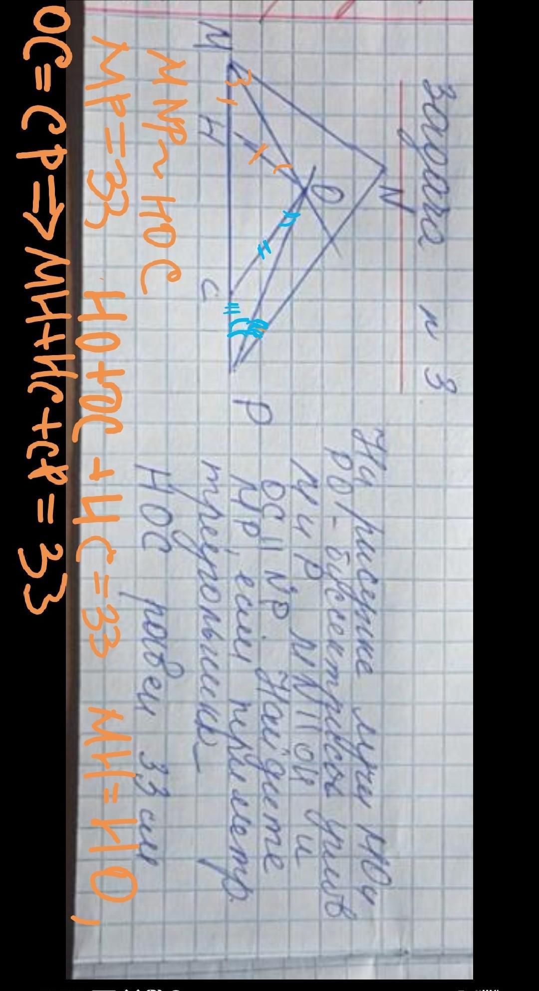 На рисунке лучи MO и РО биссектриссы углов М и Р.MN параллельна ОН и ОС парареллно NР.Найдите МР если периметр треугольника НОС равен 33 см.