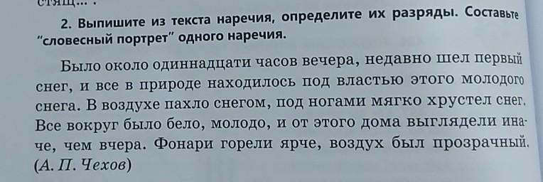Выпишите из текста наречия, определите их разряды . Составьте "словесный портрет " одного наречия.