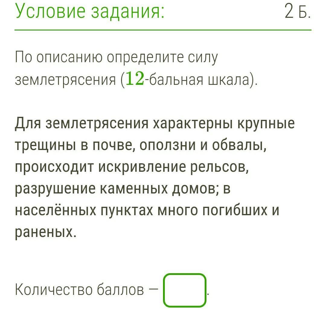 10 баллов — возникают крупные трещины в почве, оползни и обвалы, происходит искривление рельсов, разрушение каменных домов; в населённых пунктах много погибших и раненых