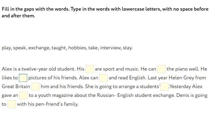play, speak, exchange, taught, hobbies, take, interview, stay.