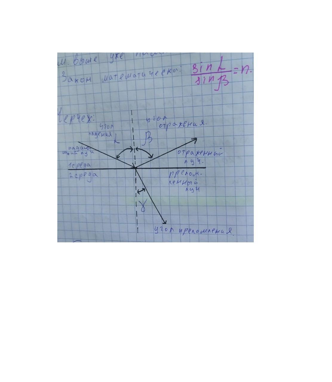 Сформулируйте закон преломления света. Сделайте чертёж. Отметьте на чертеже угол падения и угол преломления. Запишите закон математически.