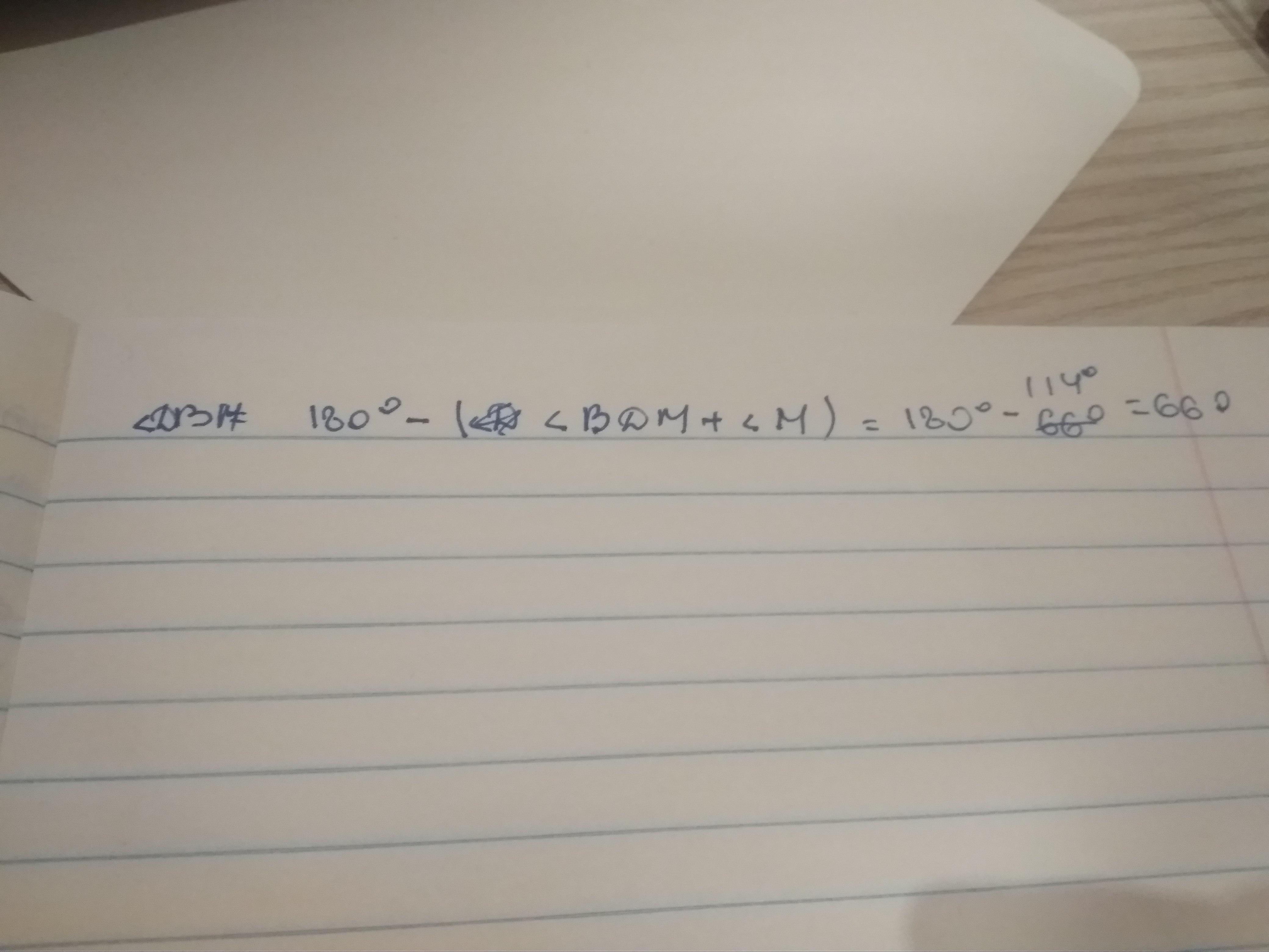 кут DBM = 180* - ( кут BDM + кут M) = 180* - 114* = 66*