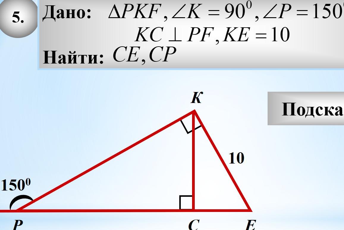 Дано: ΔPKF, ∠K = 90°, ∠P = 150°, KC ⊥ PF, KE = 10 см