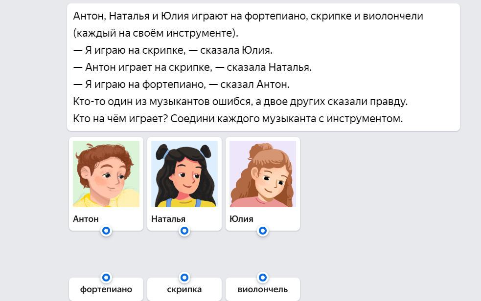 Антон, Наталья и Юлия играют на фортепиано, скрипке и виолончели (каждый на своём инструменте).