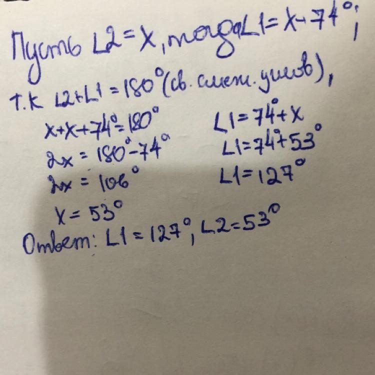 Вот, надеюсь все понятно расписала. Находить угол 1 обязательно по условию, поэтому ответ должен содержать и 1 и 2 угол. Находить величину 1 угла нужно после нахождения 2 соответственно.