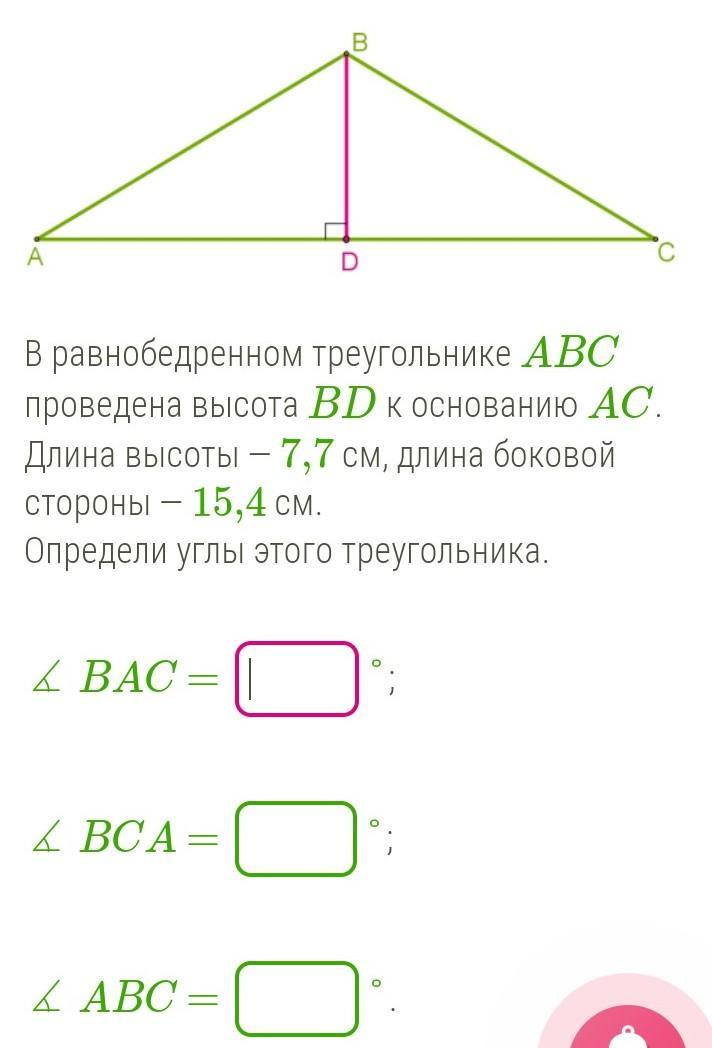 sin<BAC= BD/AB= 7,7/15,4= 1/2 => <ВАС=30°