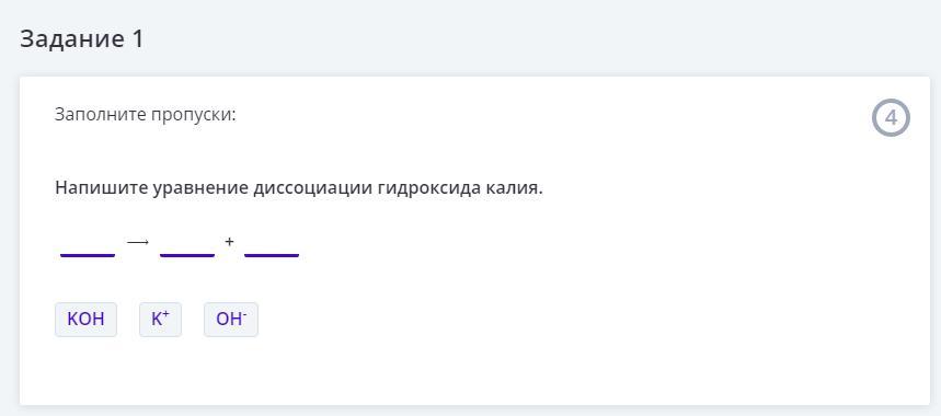 Уравнение диссоциации гидроксида калия: KOH=K(+)+OH(-)