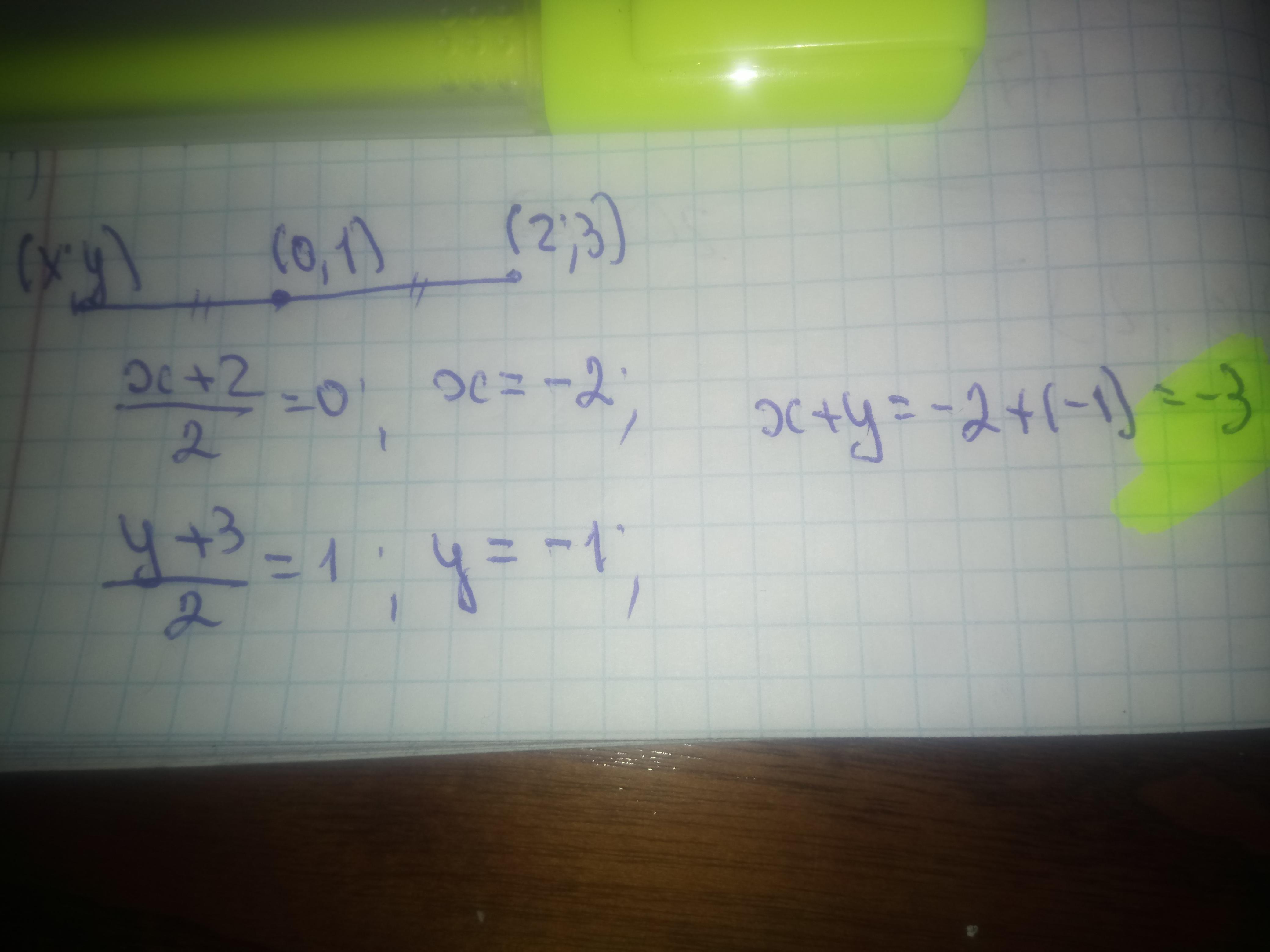 Срочно, помогите пожалуйста!!!точка(0;1) центр окружности ,а точка (2;3) один из концов диаметра.Найти сумму координат другого конца центра