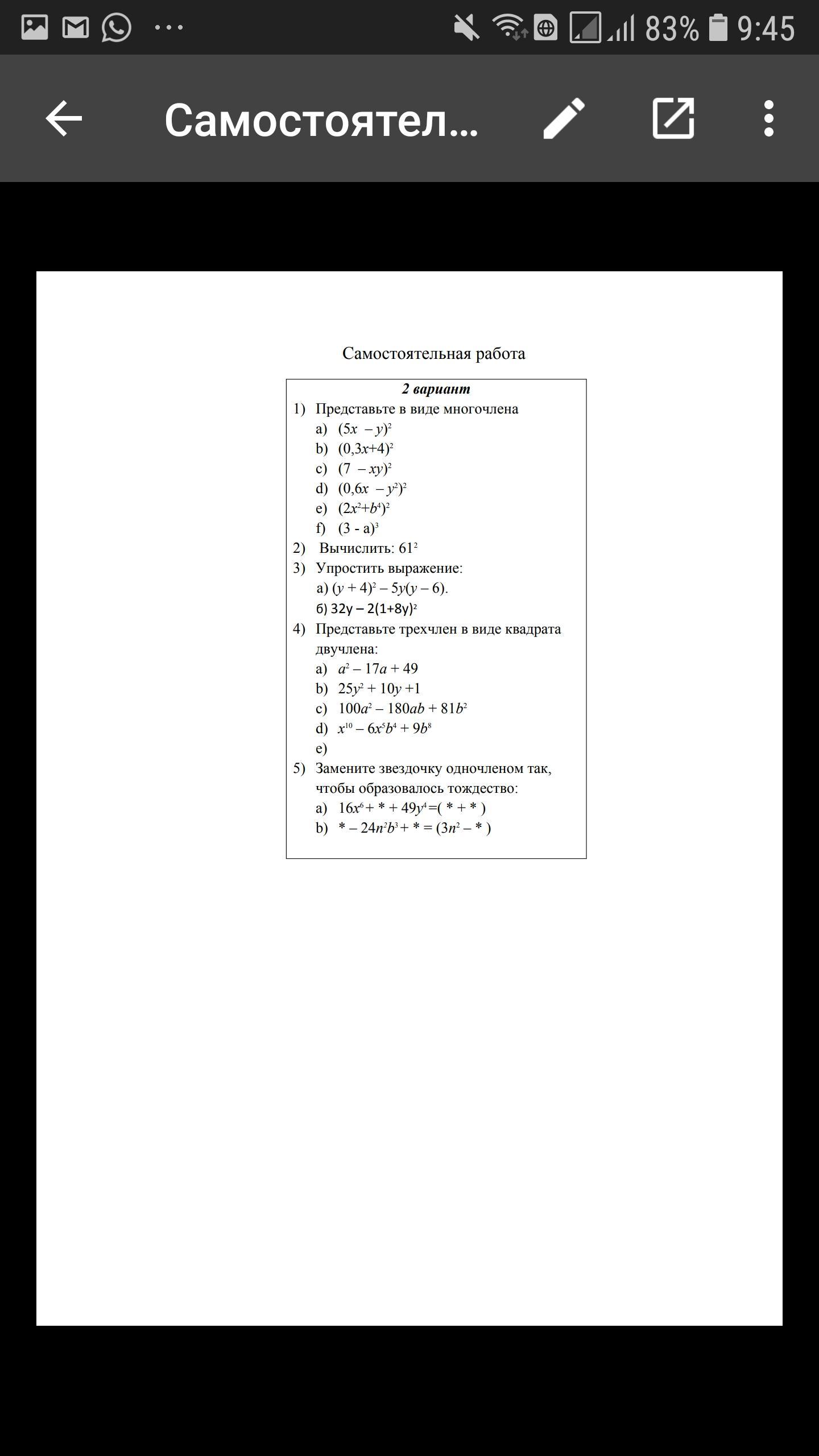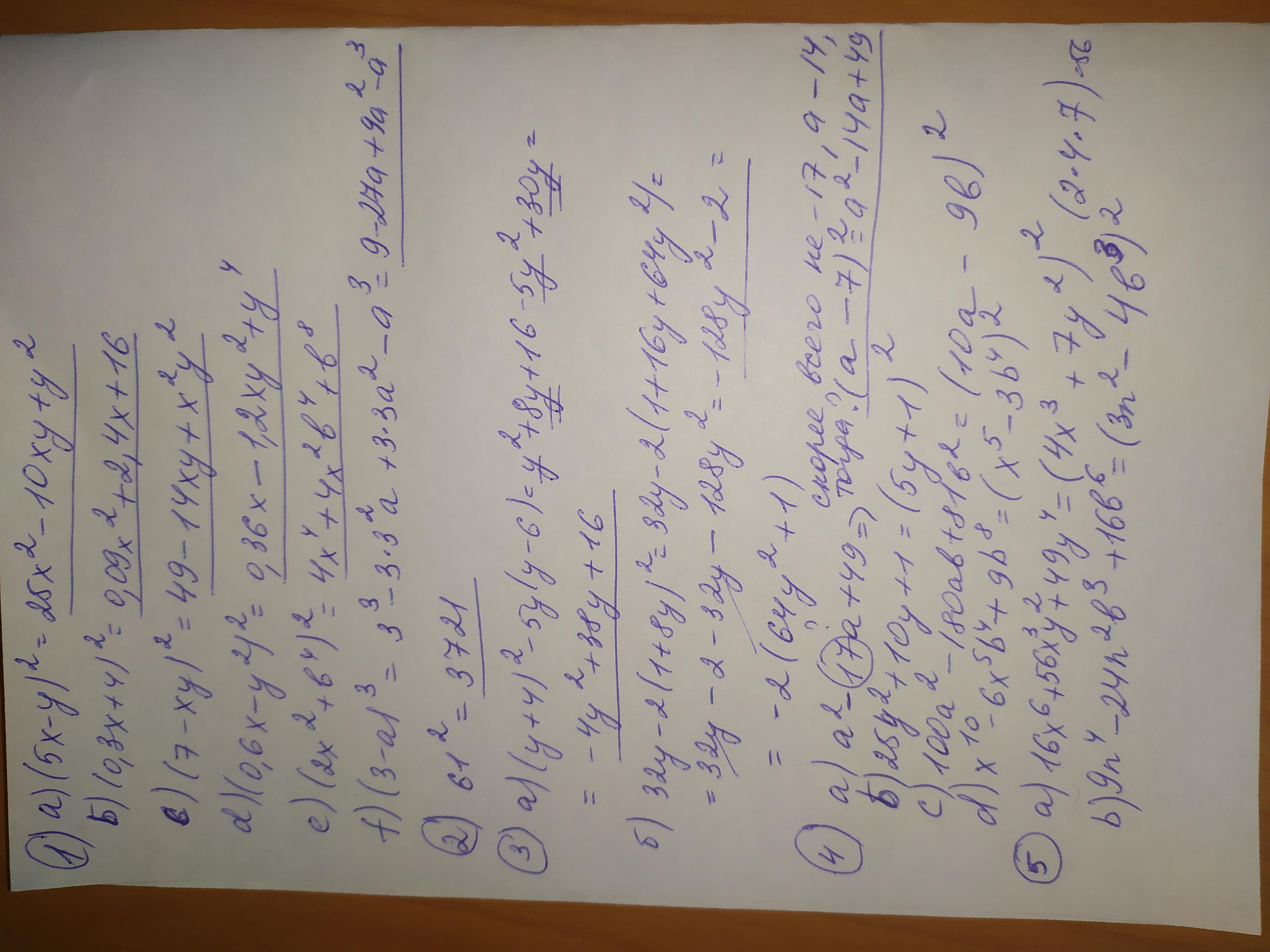В 4 задании буква А, скорее всего опечатка, при -17 невозможно представить как квадрат двучлена, скорее всего -14 должно быть. И в 5 задании в правой части потеряны квадраты за собой