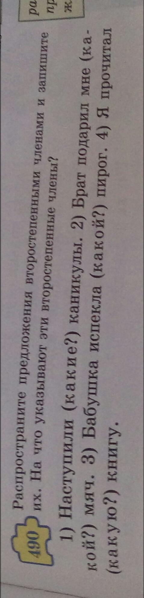 1.Наступили летние каникулы.2.Брат подарил мне футбольный мяч.3.Бабушка испекла яблочный пирог.4.Я прочитал интересную книгу.