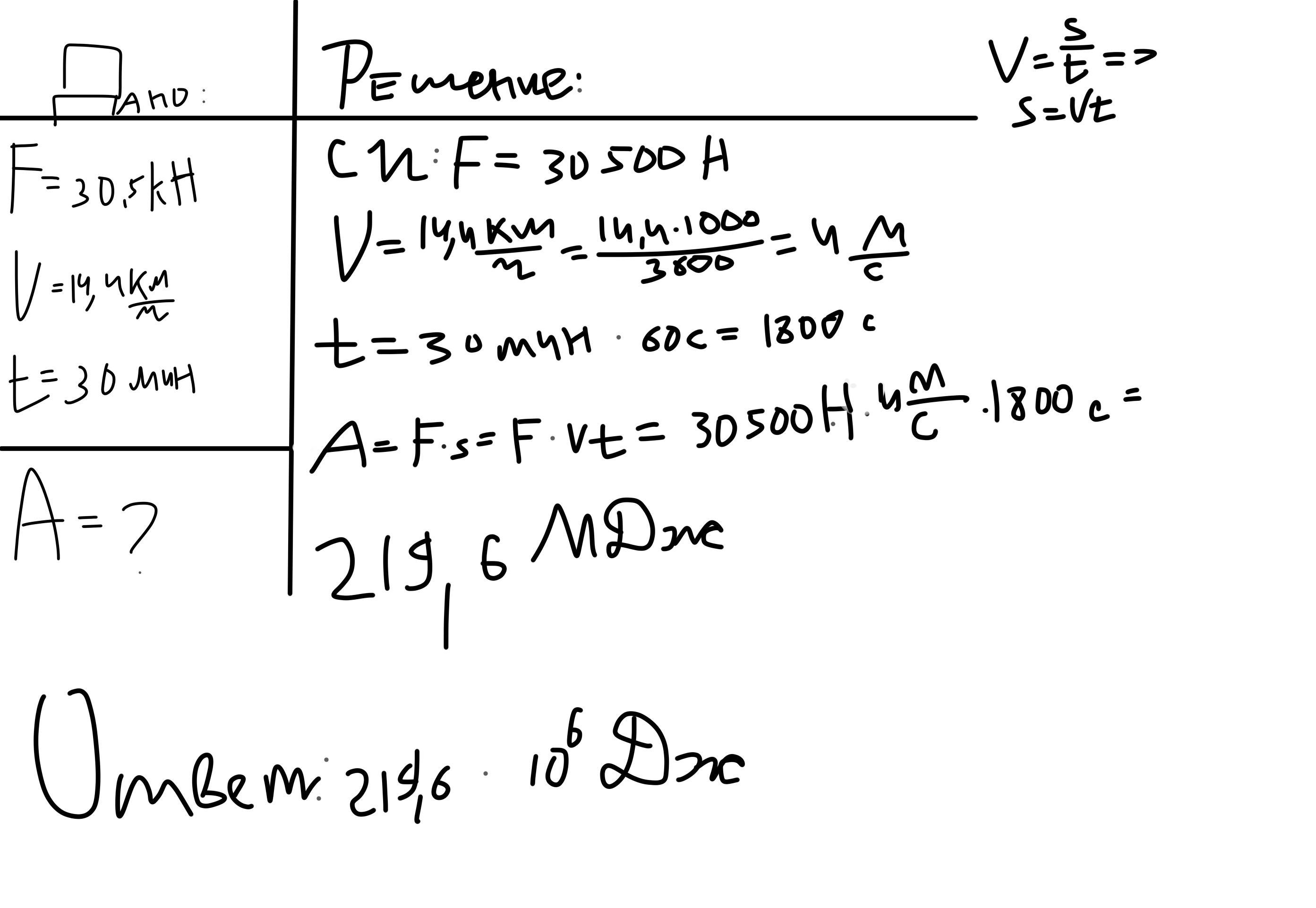 Какую работу совершит трактор за полчаса, если он развивает тяговое усилия в 30,5 кH, перемещая прицеп со скоростью 14,4км/ч???