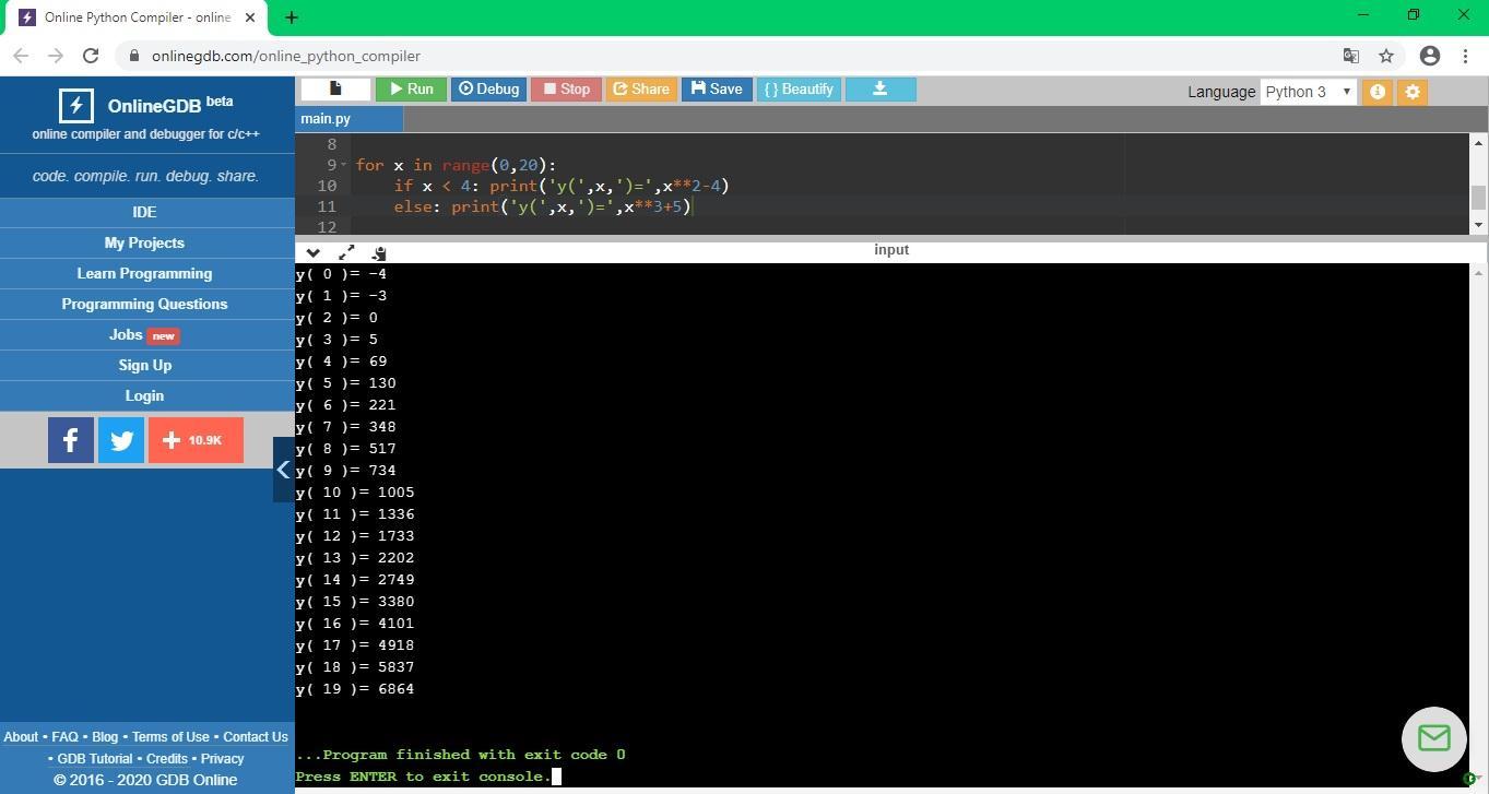 Написать программу, которая выводит таблицу значений функции y, которая на разных интервалах меняет свое значение (х меняется с шагом 1).