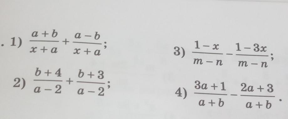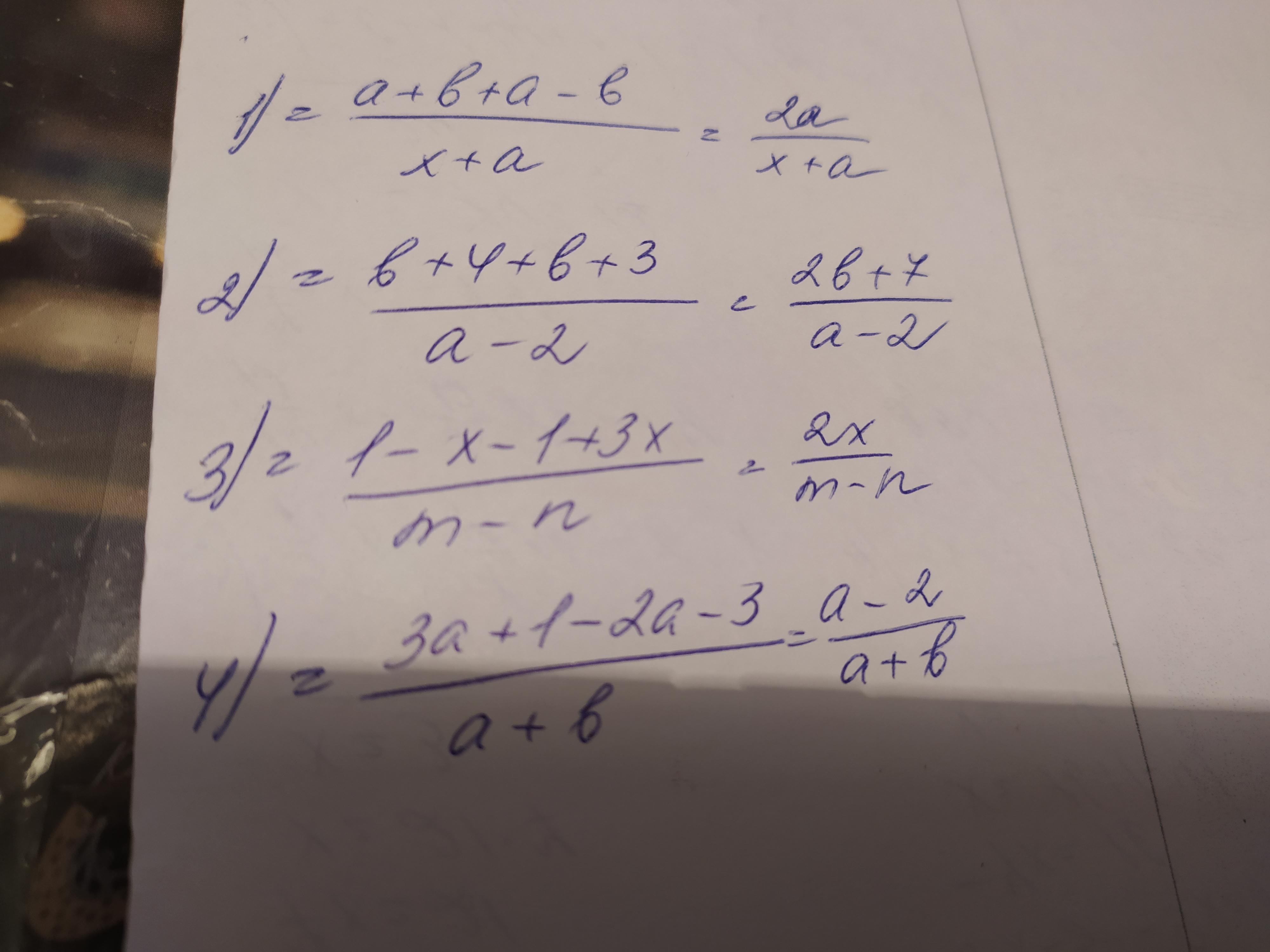1. а+б / х + а + а-б / х+а = а + б +а - б / х+ а = 2 а / х+а