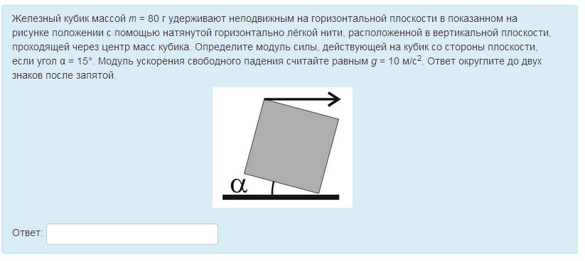 Железный кубик массой m = 80 г удерживают неподвижным на горизонтальной плоскости в показанном на рисунке положении с помощью натянутой горизонтально лёгкой нити, расположенной в вертикальной плоскости, проходящей через центр масс кубика. Определите модуль силы, действующей на кубик со стороны плоскости, если угол α = 15°. Модуль ускорения свободного падения считайте равным g = 10 м/с2. Ответ округлите до двух знаков после запятой.