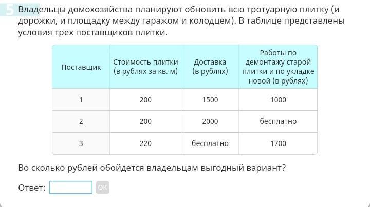 5) Владельцы домохозяйства планируют обновить всю тротуарную (и дорожки, и площадку, между гаражом и колодцем).В таблице представлены условия трёх поставщиков плитки.