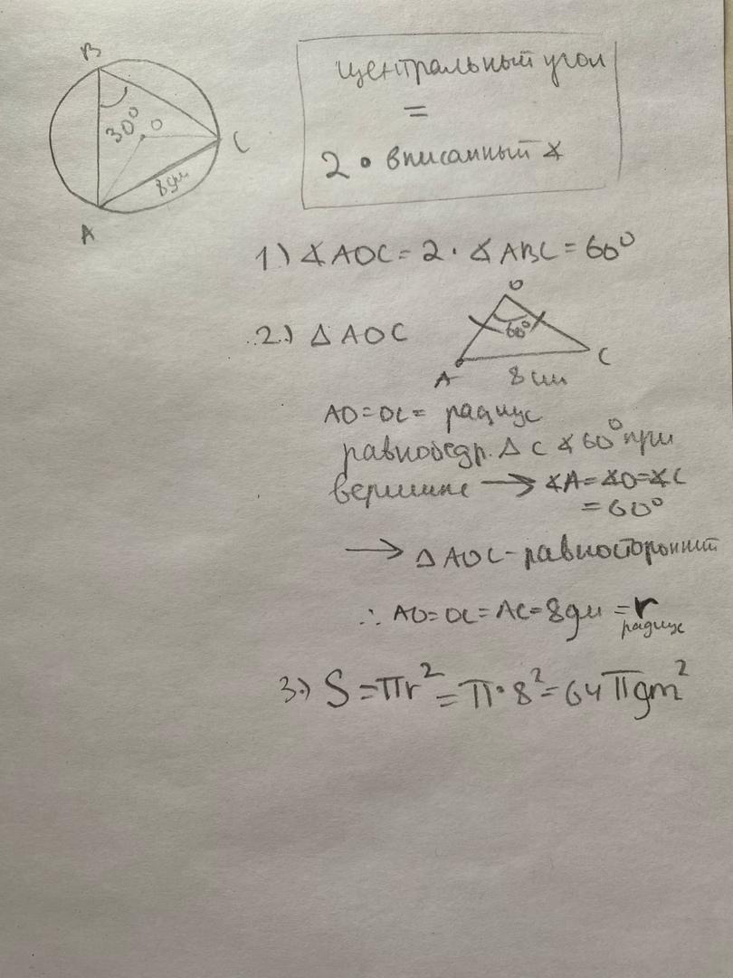 Вычисли площадь круга, если хорда равна 8 дм, а опирающийся на неё вписанный угол равен 30°.