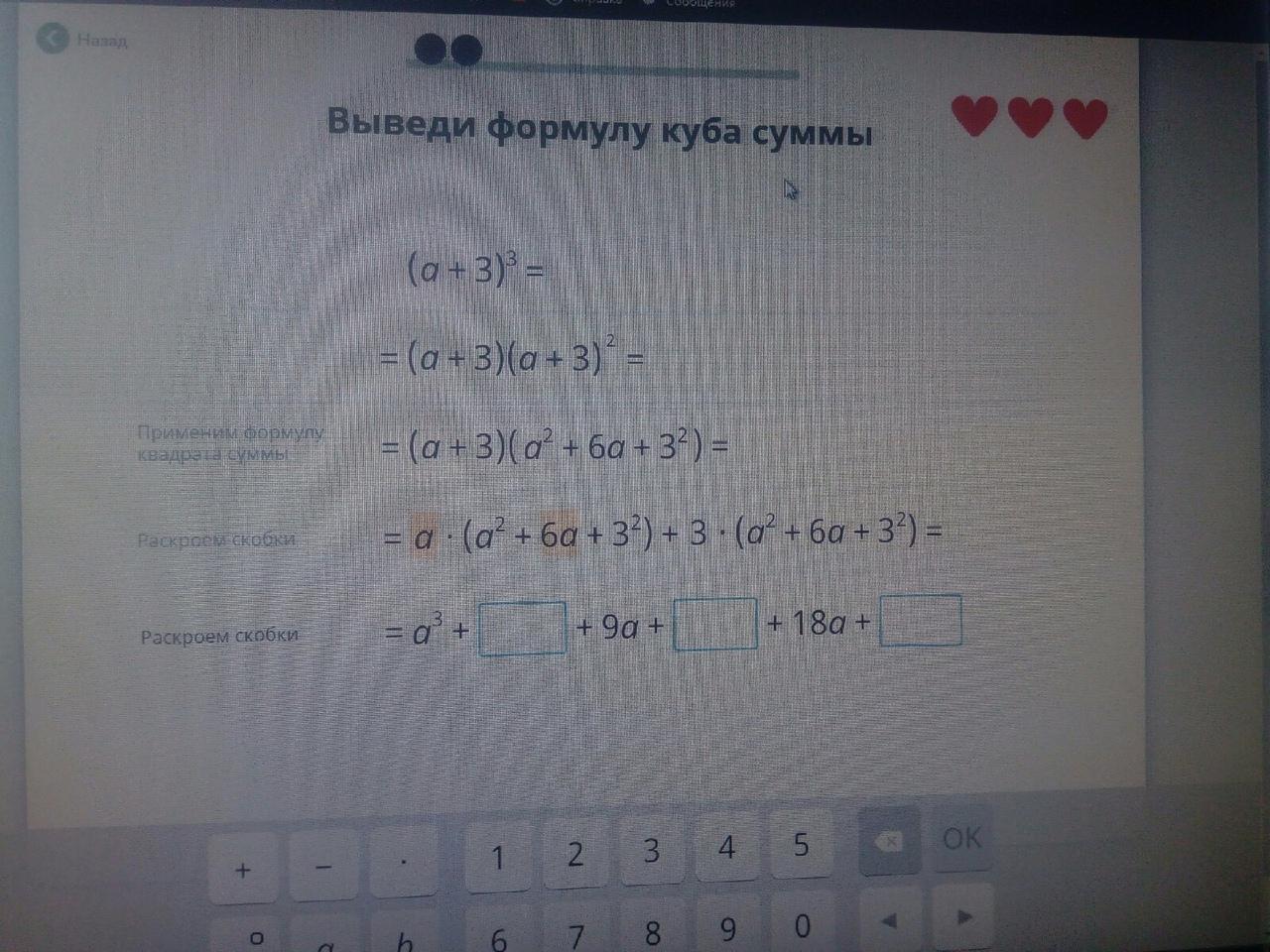а×(a²+6a+3²)+3×(a²+6a+3²)= a×a²+a×6a+a×3²+3× а²+3×6a+3×3²= a³+6a²+9a+3a²+18a+27