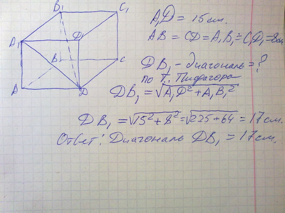 Диагональ одной из граней прямоугольного параллелепипеда равна 15 см, а ребро перпендикулярное к этой грани имеет длину 8 см. Найдите диагональ параллелепипеда.