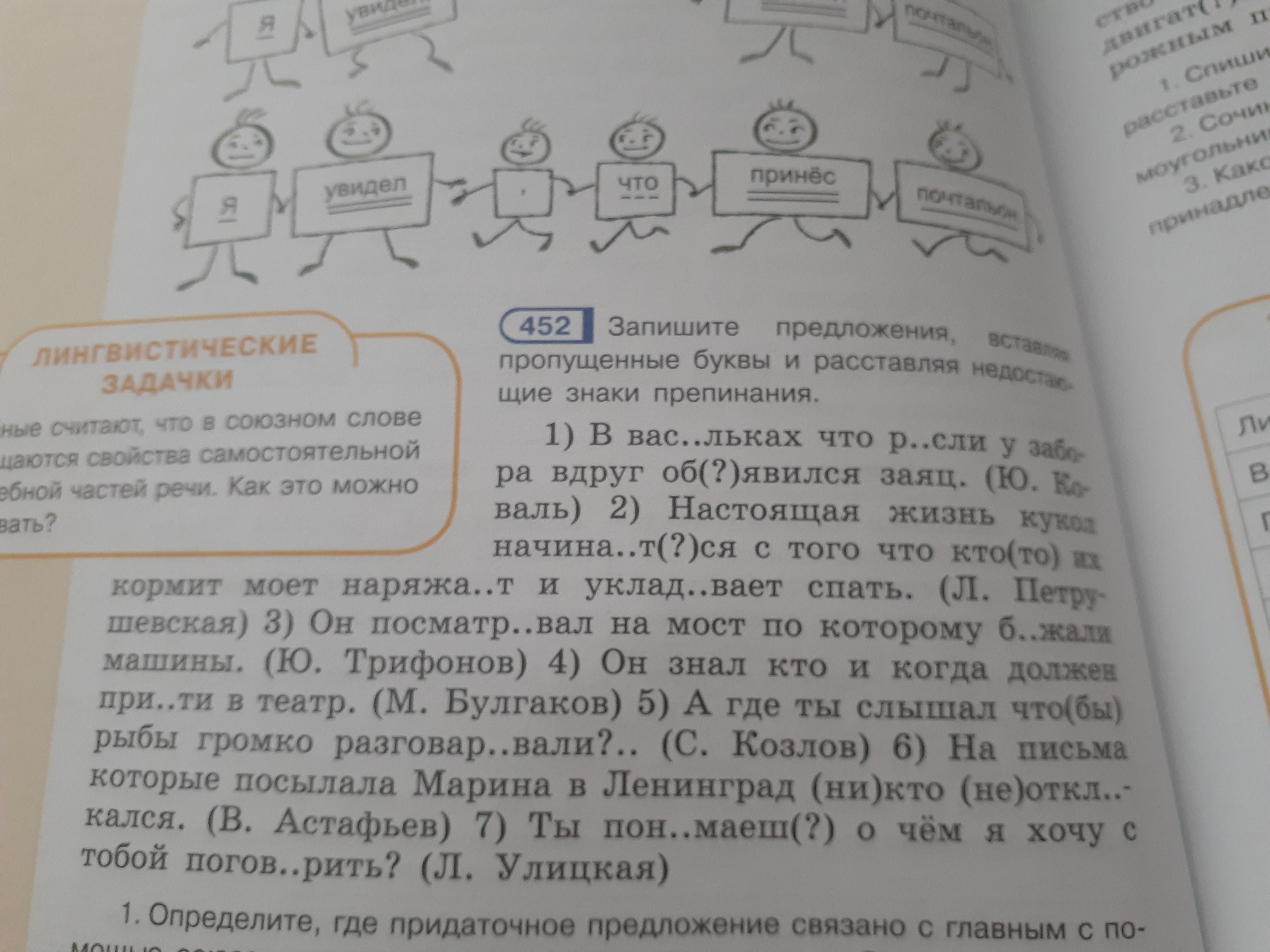 1)В васильках, что росли у забора вдруг объявился заяц 2) Настоящая жизнь кукол начинается с того, что кто-то их кормят моет наряжает и укладывать спать3)Он посматривал на мост по которому бежали машины 4) Он знал кто и когда должен прийти в театр 5) А где ты слышала, чтобы рыбы громко разговаривали? 6) На письмо которое прислала Марина в Ленинград никто не отвлекался 7) Ты понимаешь о чём я хочу с тобой поговорить?
