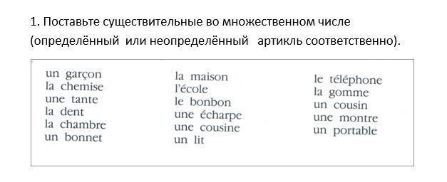 des garcons, les chemises, des tantes, les dents, les chambres, des bonnets, les maisons, les ecoles, les bonbons, des echarpes, des cousines, des lits, les telephones, les gommes, des cousins, des montres, des portables.