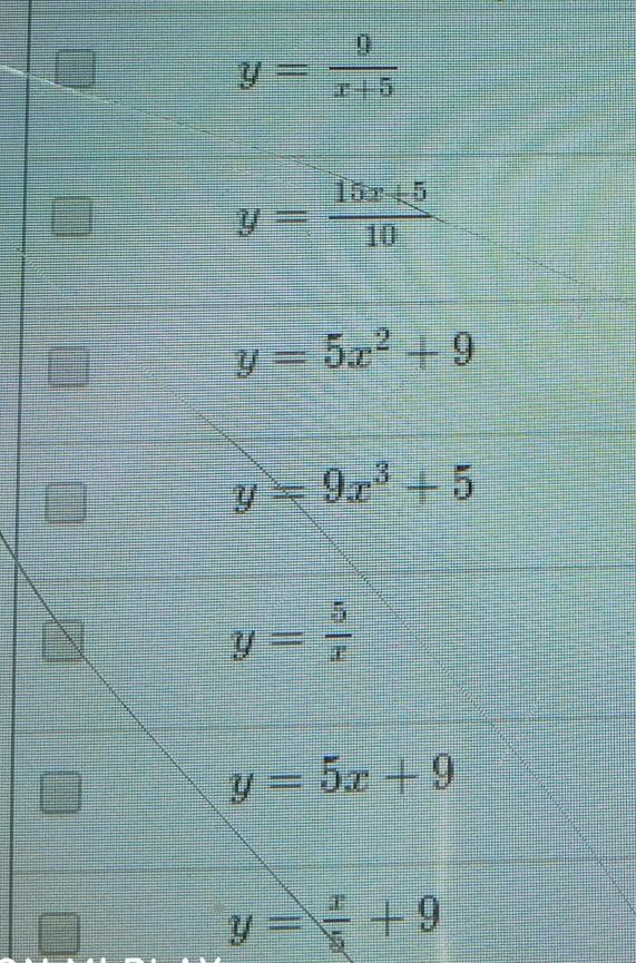 y=\frac{15x+5}{10}\\y=5x+9\\y=\frac{x}{5} +9