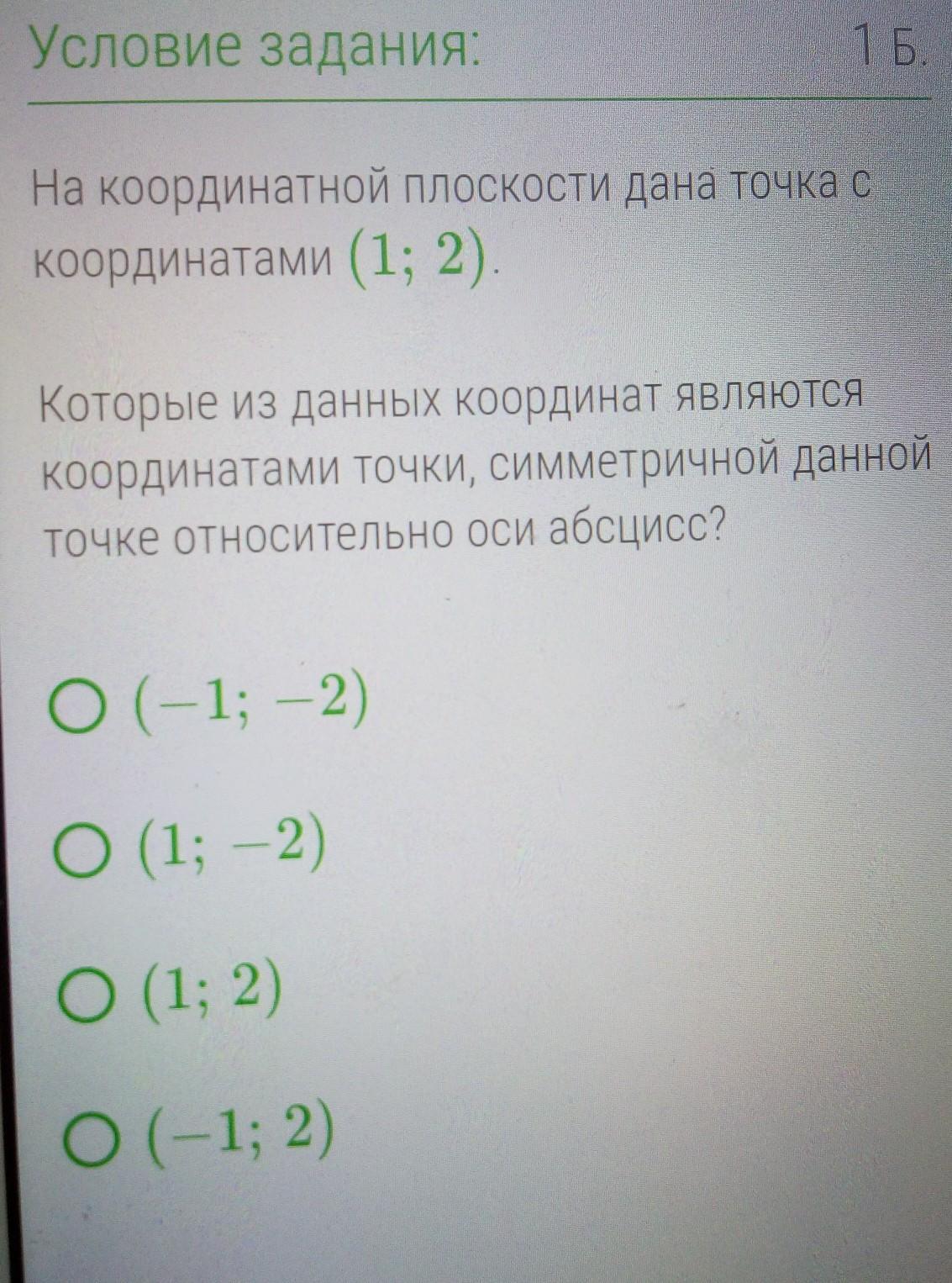 Ось абсцисс, это ось Ox. Если точка симметрична другой точки, относительно оси Ox, то у них отличающиеся по знаку координаты по Y, но одинаковые по X.