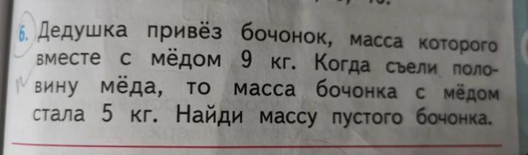 Если 9кг-весь мёд+бочонок,а 5кг половина мёда+бочонок,то можно найти съеденную половину мёда.